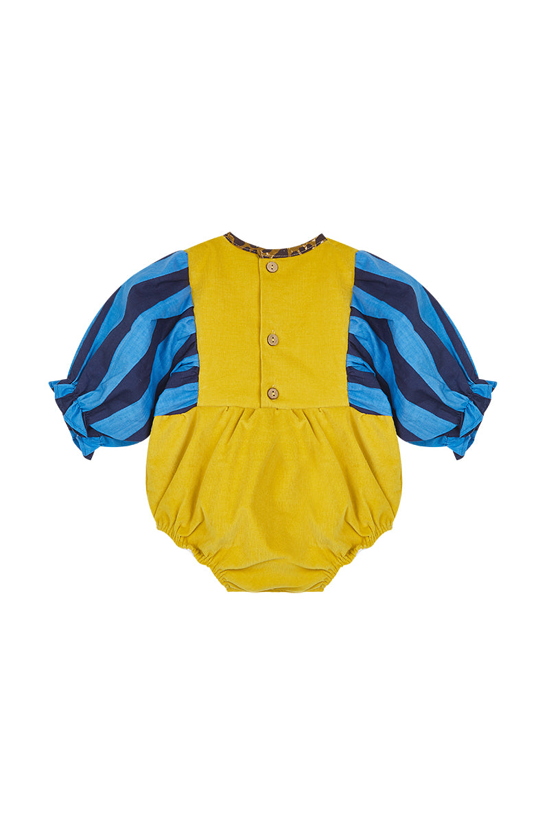 Corduroy & cotton romper with puffed sleeves, animal-print ribbon, and coconut buttons.