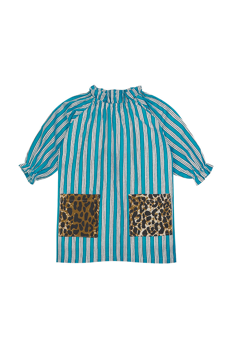 Striped dress with animal print front pockets and coconut buttons at the back.